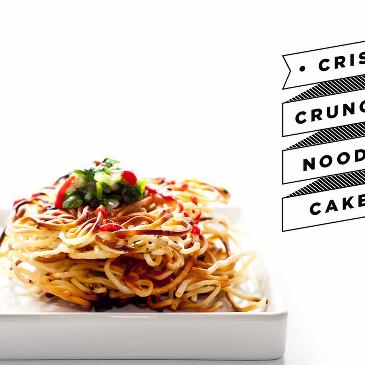 Crispy Noodle Cake later Chow Mein Noodles, Green Onions, Garlic, Shallot, Ginger, Canola Oil, Sesame Oil, Salt, Pepper, Oil, Sriracha