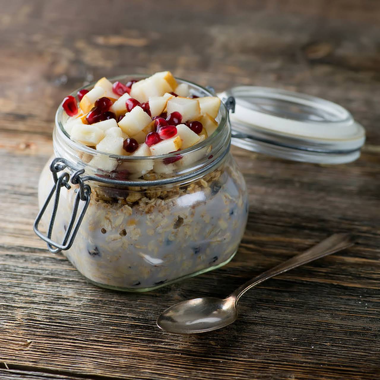 Overnight Oatmeal! past Rolled Oats, Milk, Honey, Raisins, Chopped Walnuts, Cinnamon, Vanilla Extract, Granola, Fruit