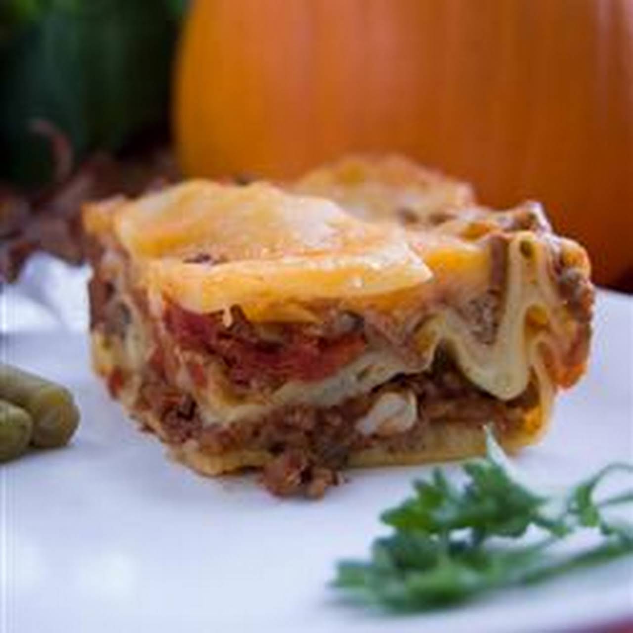 Restaurant Style Lasagna subsequent to Lasagna Noodles, Ricotta Cheese, Mozzarella Cheese, Grated Parmesan Cheese, Eggs, Lean Ground Beef, Dried Oregano, Dried Basil, Garlic Powder, White Sugar, Pepper, Salt, Tomato Sauce