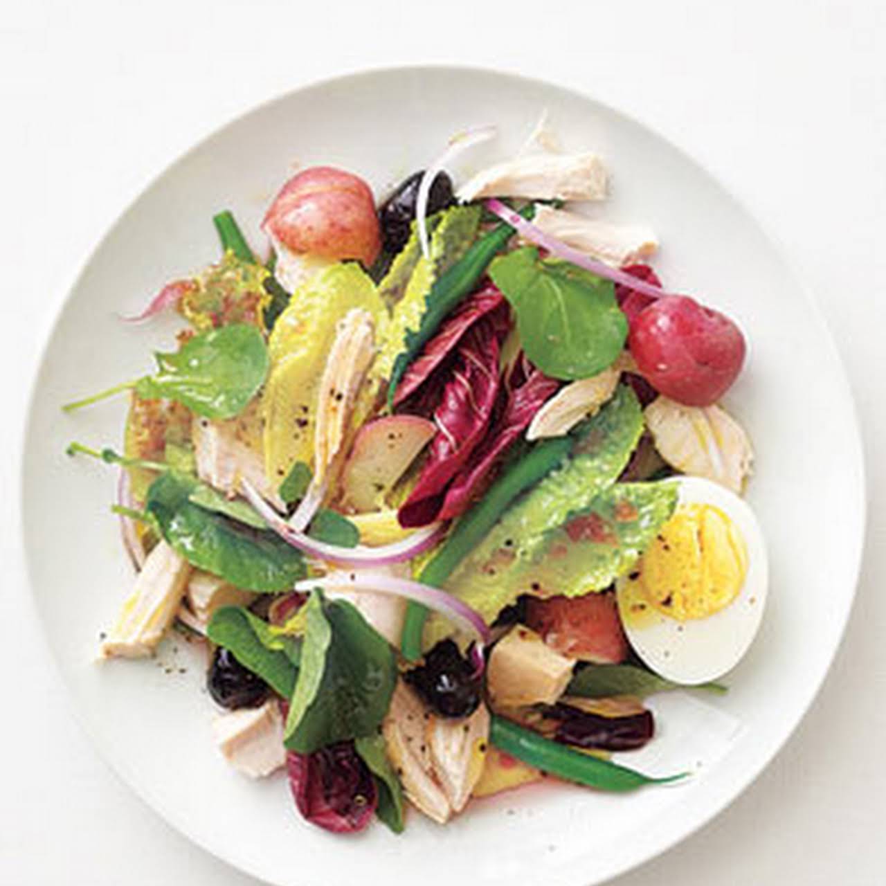 Chicken Nioise Salad taking into consideration Green Beans, supplementary Potatoes, Large Eggs, Salad Greens, Rotisserie Chicken, Red Onion, Black Olives, Vinaigrette